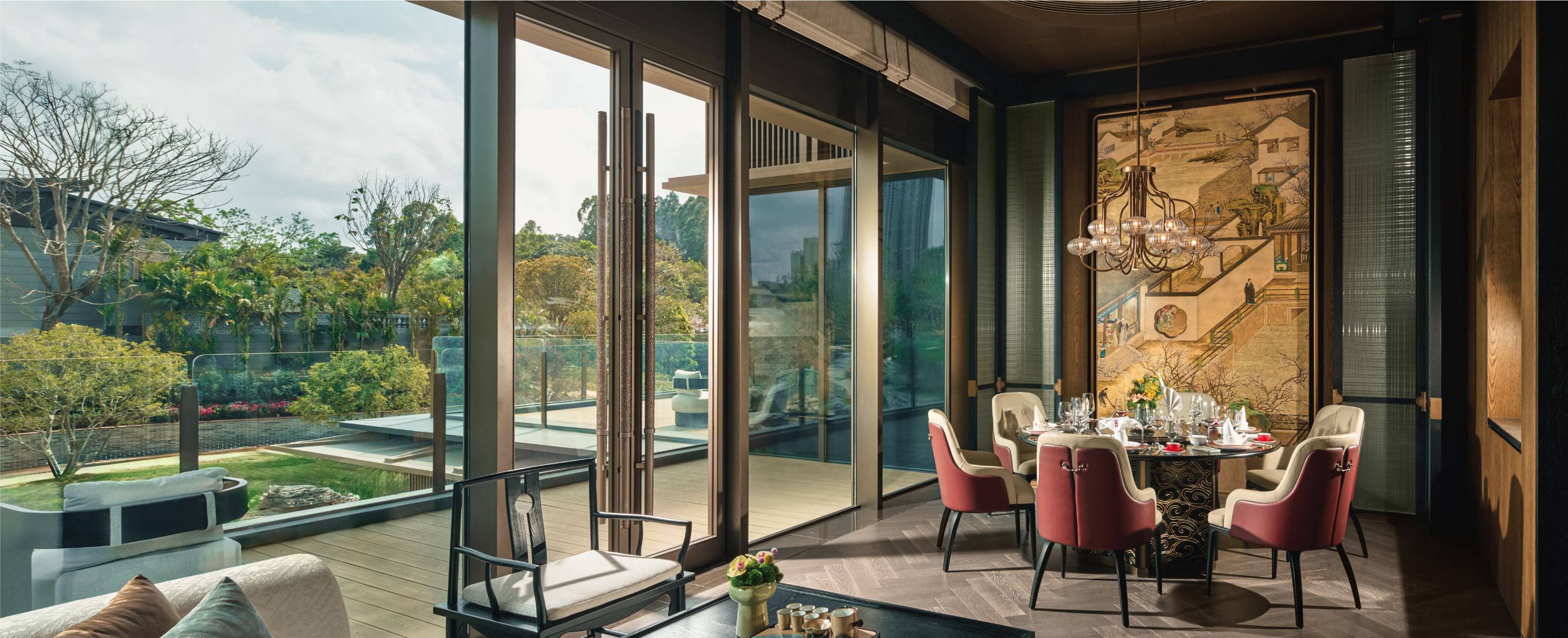 从酒店园林水系汲取灵感,并参考杭帮菜“清汤鱼丸”,经创意革新演变而来。汤中莲蓬采用新鲜鲮鱼肉混合无菌蛋白手工制成,象形莲藕采用竹笙包裹手剁新鲜虾滑制成,配以清炖黄油老鸡汤,汤清味鲜。