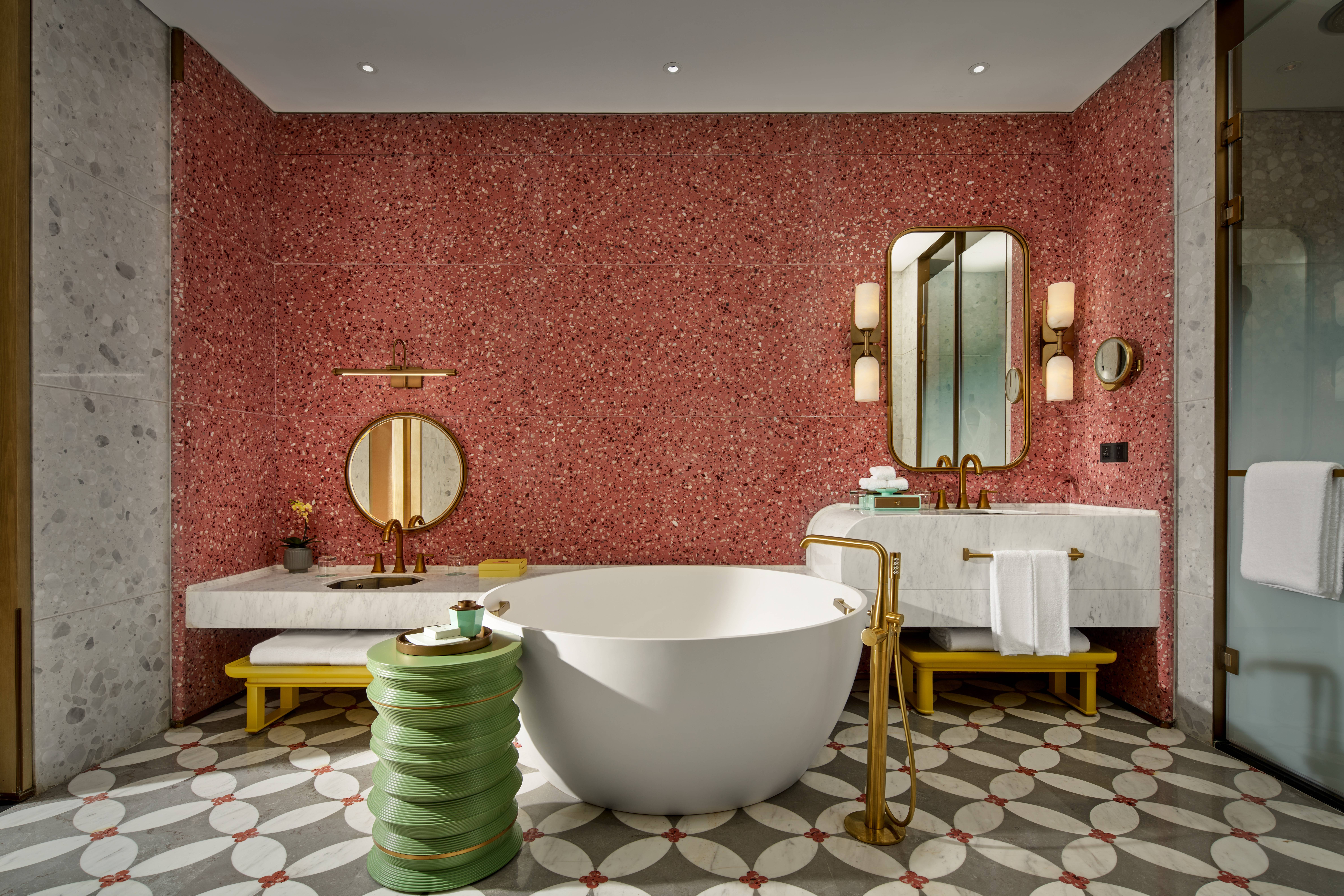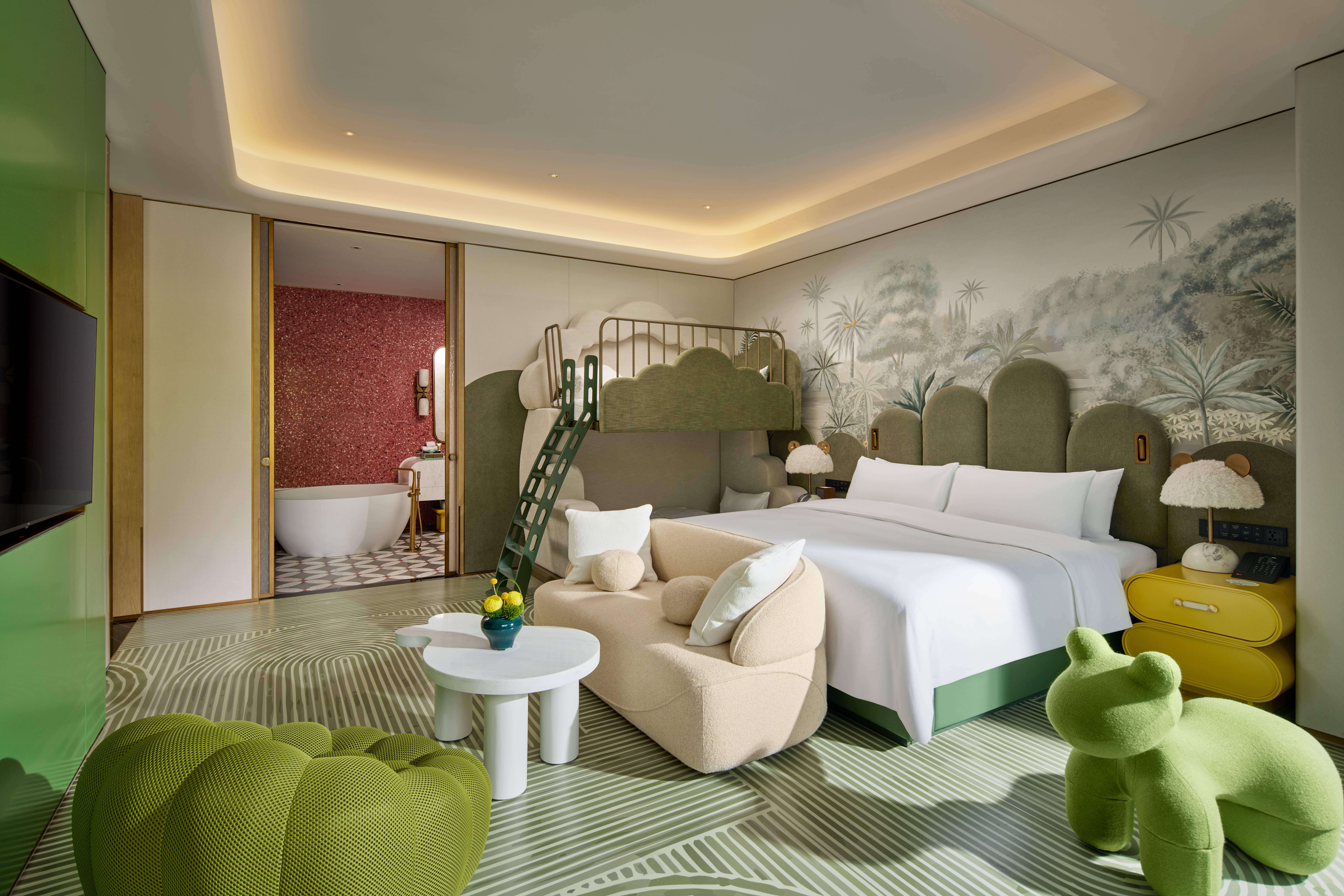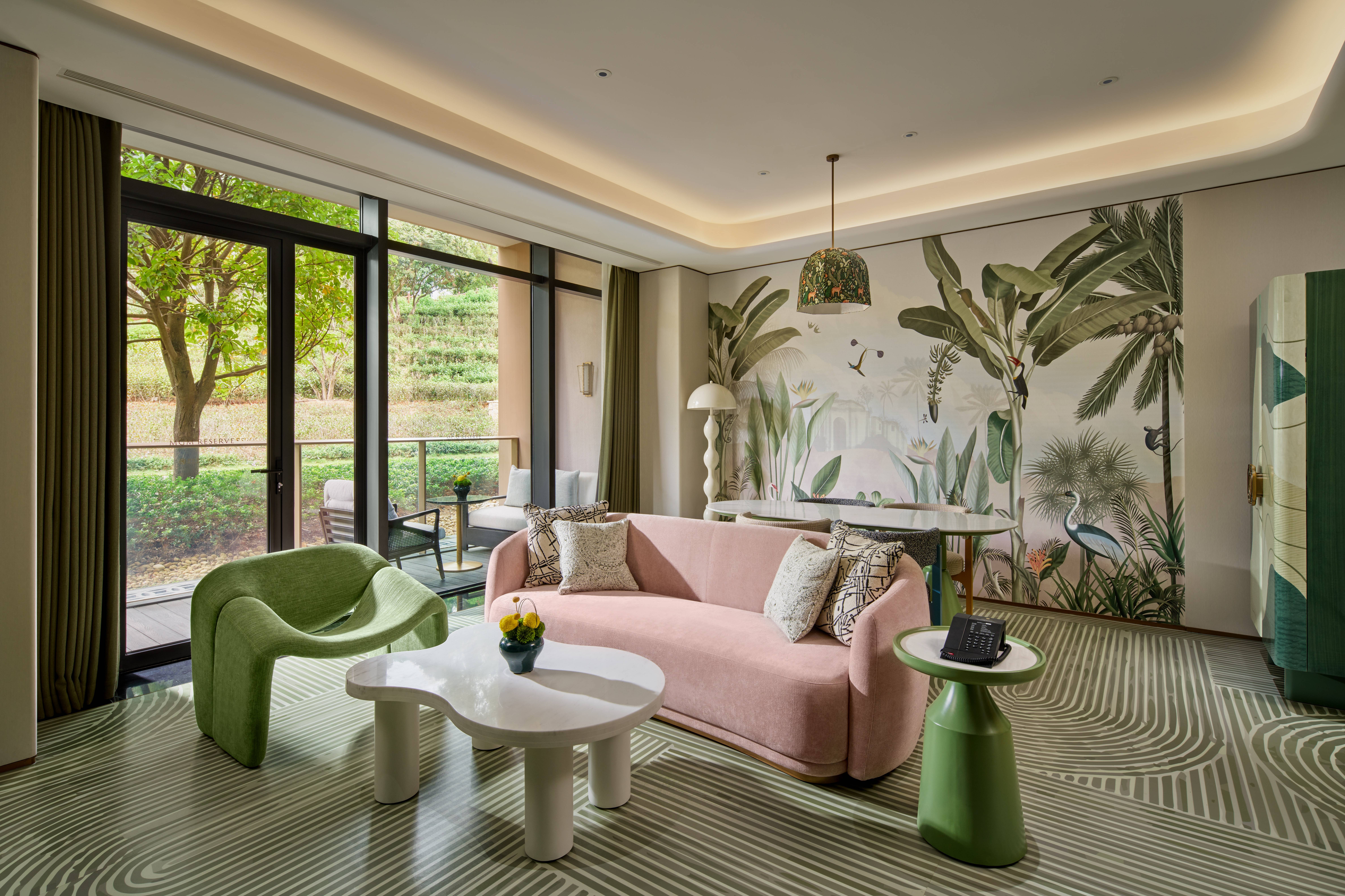 房间内自带庭院尽览园林秀美景致,恰宜雅聚小酌漫谈浮生。宽敞的步入式衣帽间内设有雅致的梳妆台,既显典雅又兼具实用性。整个空间洋溢着童趣与当代中国风韵的设计元素,高品质的设施与艺术品点缀其中,精致的器皿错落有致地陈列于房内,使宾客在放松身心、沉浸山林之际,亦能感受艺术对心灵的润泽。
